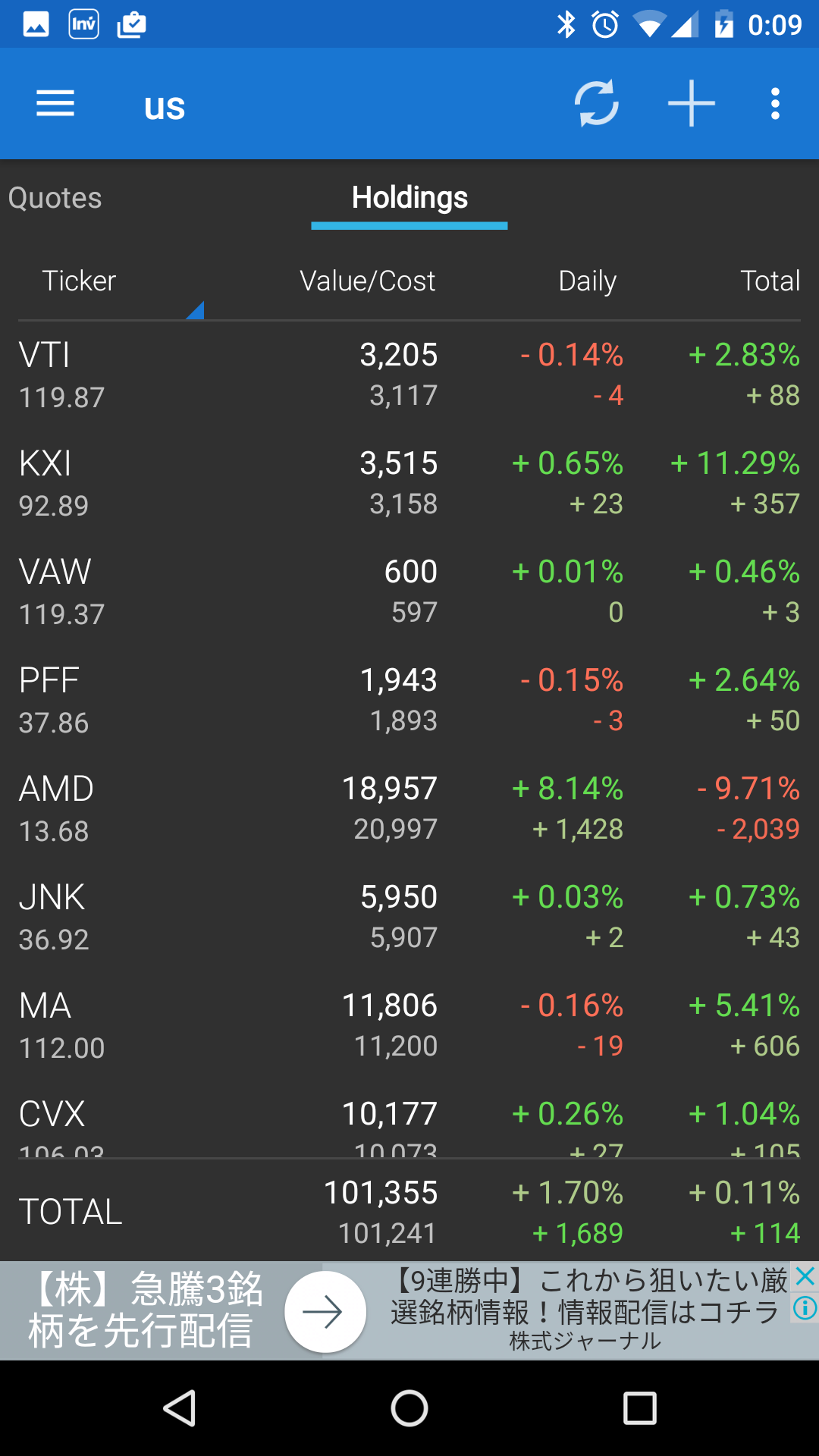 ちなみに上記のアプリはMy Stocks Portfolio and Widgetというものです。広告の出ない有料版もありますが、僕は無料版を使っています。