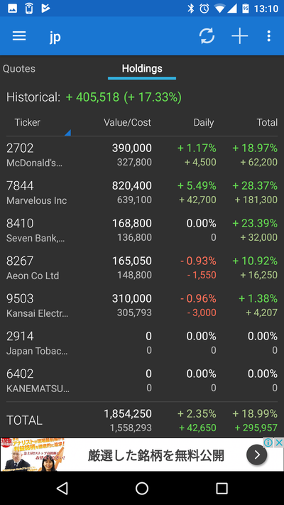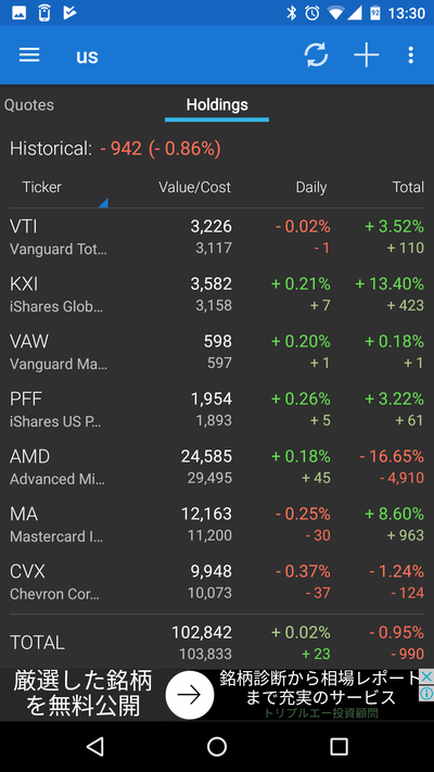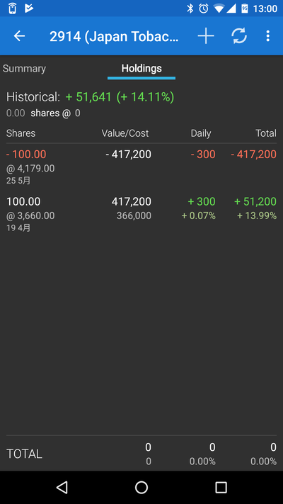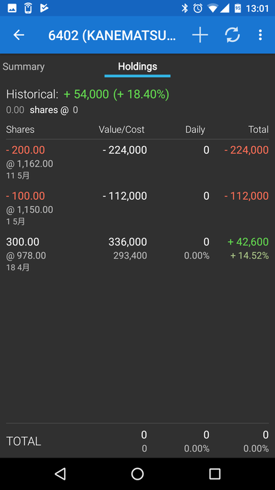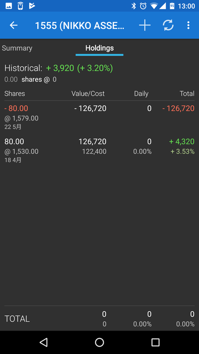 ※上記アプリはMy Stocks Portfolio and Widgetというものです。4月18日に導入したようです。それ以前の履歴は実体通りに細かく入力するといったことはせず、まとめて平均購入価格で4/18付購入として入力しています