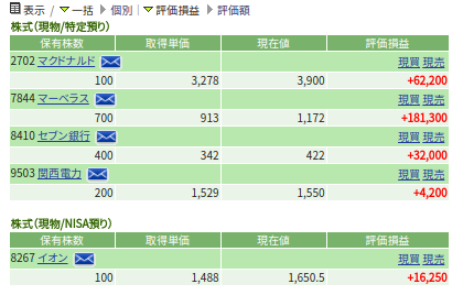 - マクドナルド、マーベラス、セブン銀行も想定以上の含み益となっているが、買値を割って下がる要因が今のところ思いつかないので継続して保有する予定