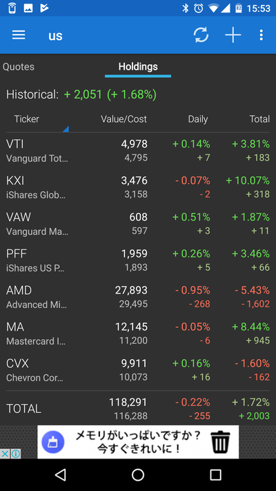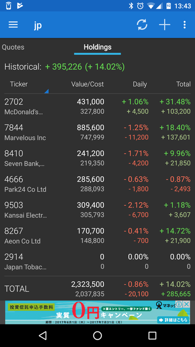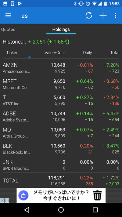 ※上記アプリはMy Stocks Portfolio and Widgetというものです。4月18日に導入したようです。それ以前の履歴は実体通りに細かく入力するといったことはせず、まとめて平均購入価格で4/18付購入として入力しています