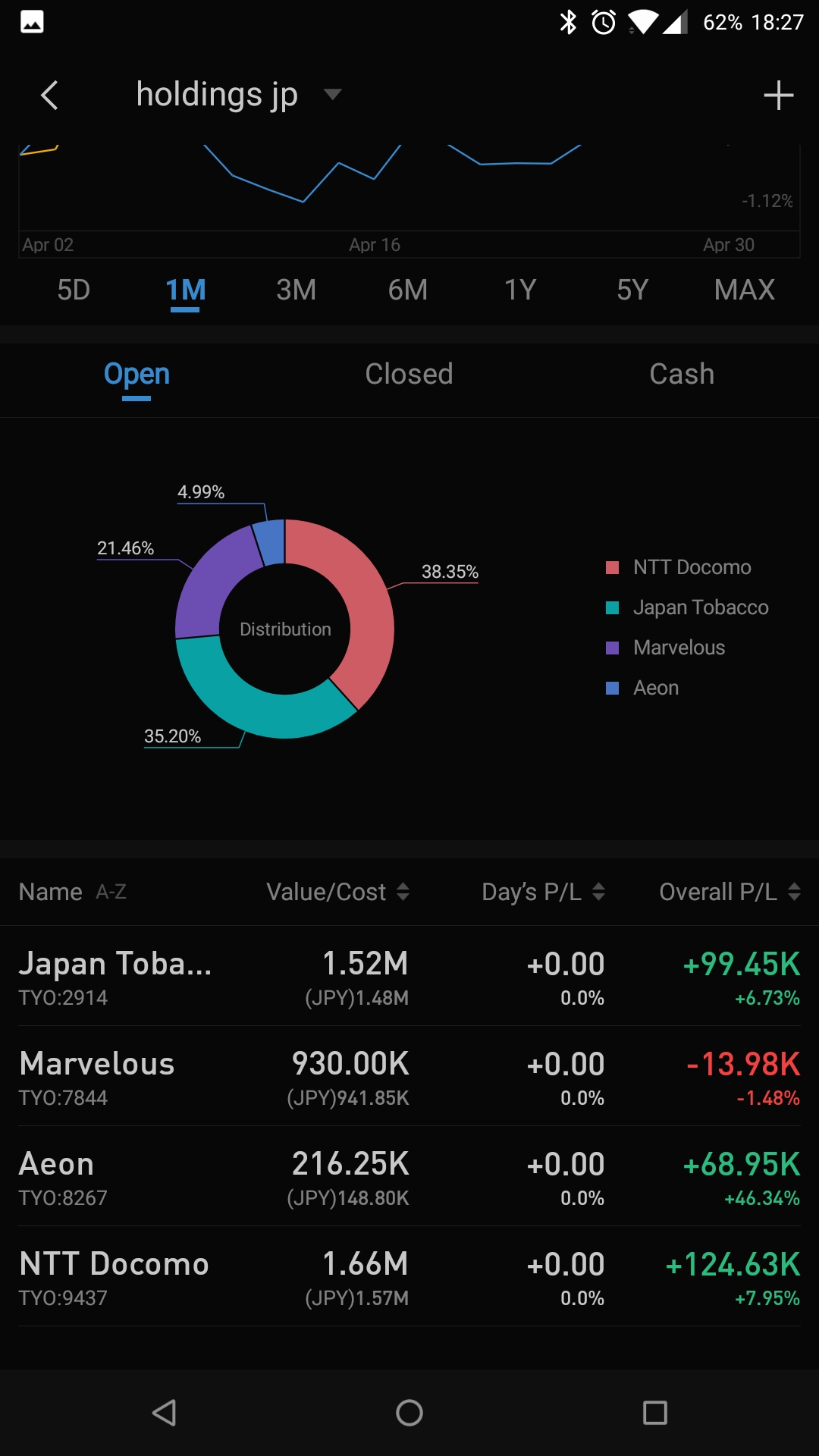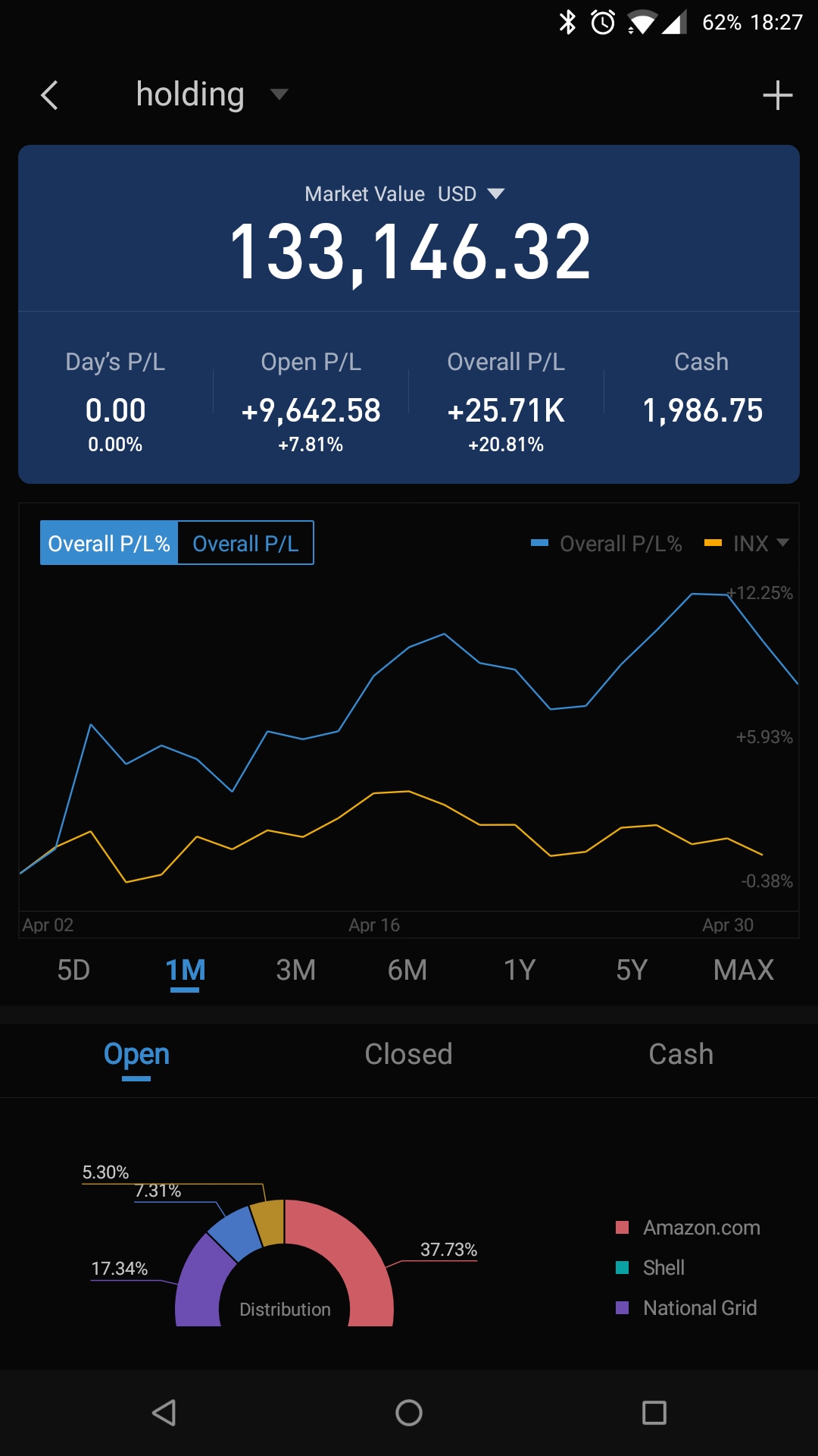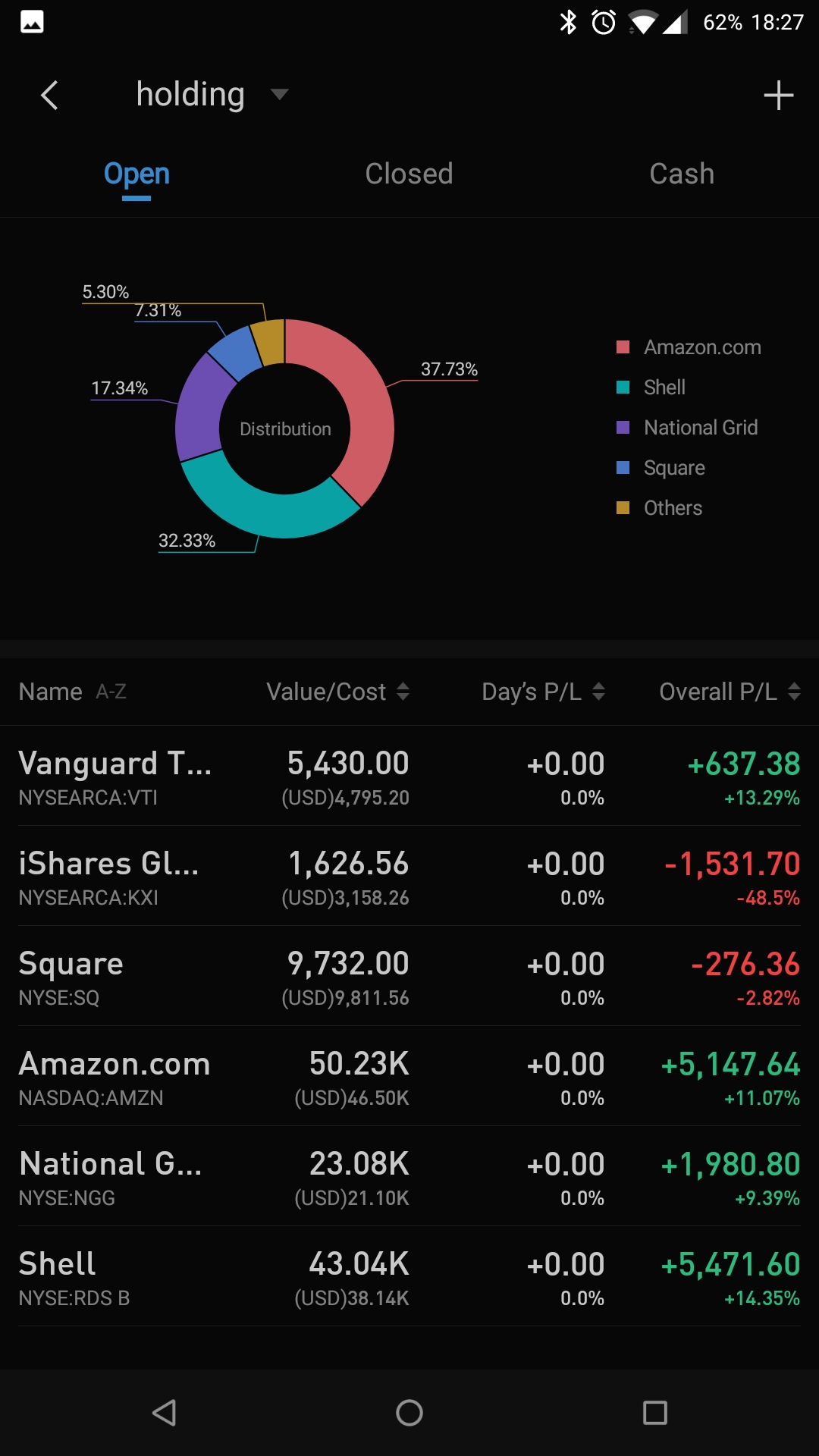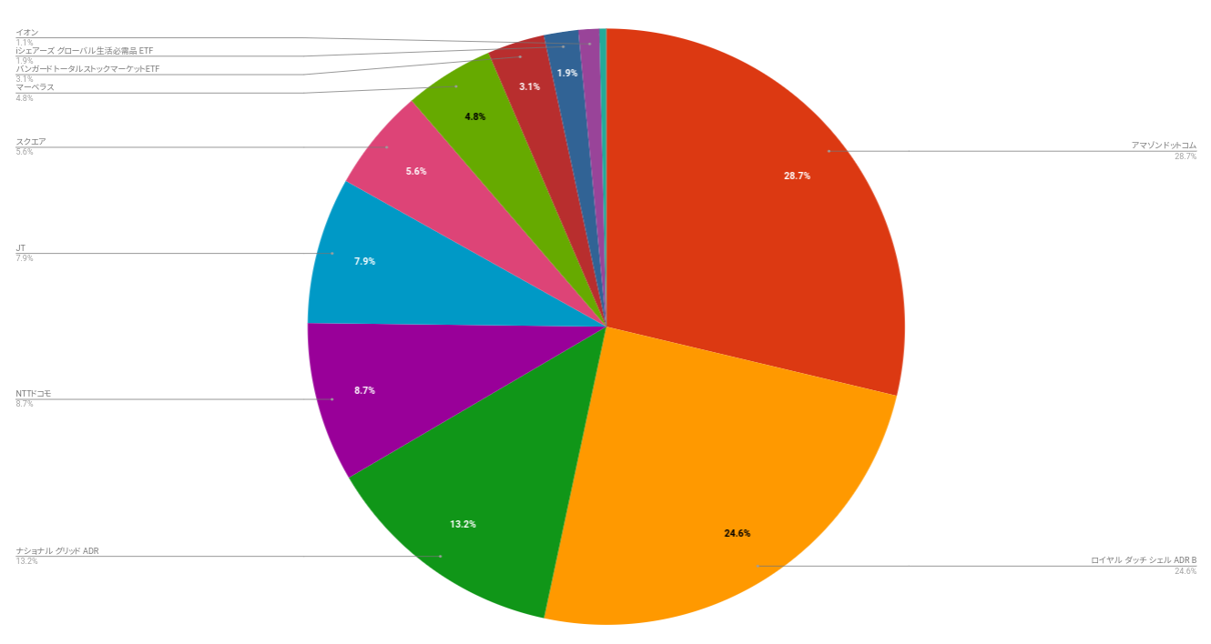 AMZNがやや復調したのとRDS-Bが堅調なのもあって、AMZNとRDS-Bだけで過半数を占めるようになりました。