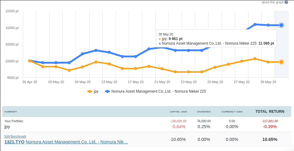 2ヶ月連続で日経平均に負けてるけど年初来だとまだ勝ってる(が、すぐ追い抜かれそう)。引き続き現金が潤沢にあるけど焦って買っても仕方ない。ちまちまと買い進めていく。
