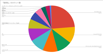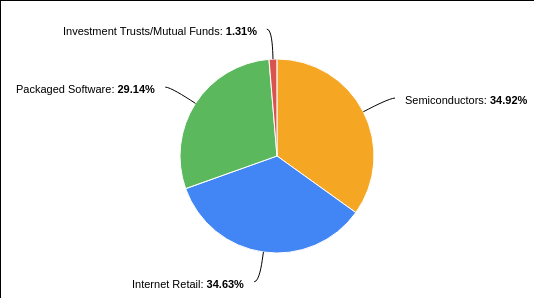 Packaged Softwareが$MSFT、Internet Retailが$AMZN, $SHOP, $BABA、Semiconductorsが$AMDと$TSMという内訳になっています。僕は$MSFTは$AMZNと$BABAの仲間だけど$SHOPは明確に違うと考えているのであまりしっくり来ない。そもそもS&Pか何かが作ったセクター分類には全然興味がないにもかかわらず、それに基づくとちょうど1/3ずつくらいになってしまっていた。ちなみにInvestment Trusts/Mutual Fundsは大昔にNISAで買ったVTIです。