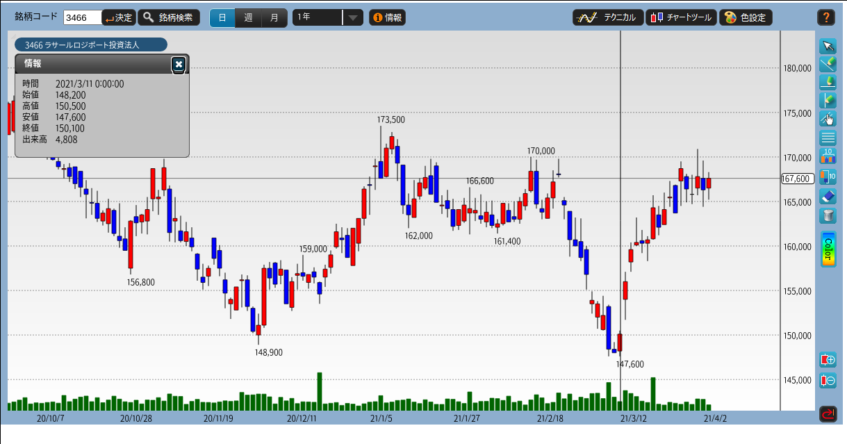 ↑ラサールロジ(3466)は15万円弱で上手く買えた。このチャートの3/11の引け間際に買ったので、相当いいタイミングで買えた。すでに含み益は約3年分の分配金に相当するのでいったん売ってもいいし、このままホールドしてもいい。
